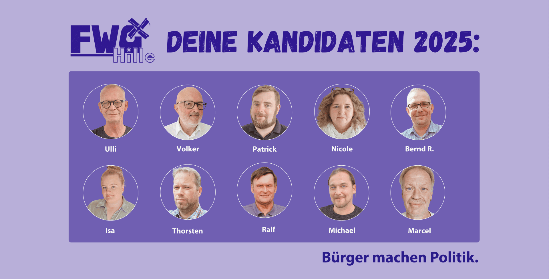Wir sind die Freie Wählergemeinschaft der Gemeinde Hille. Unser Augenmerk und Interesse gilt den Menschen in den neun großartigen Ortschaften in unserer Gemeinde. Dabei sind wir unabhänging von Bundes- und Landespolitik.